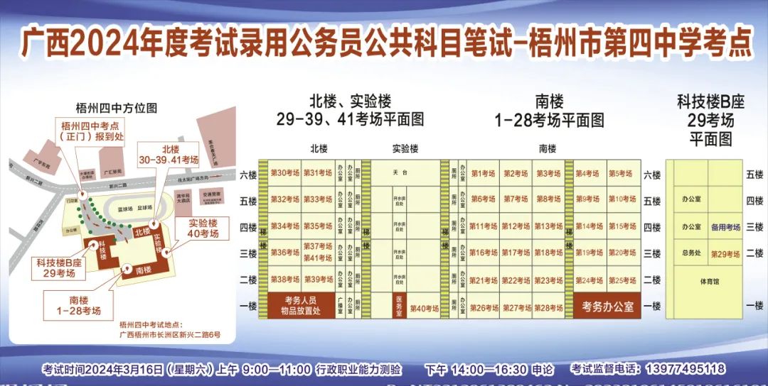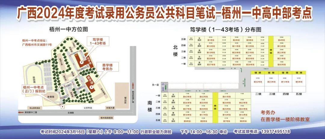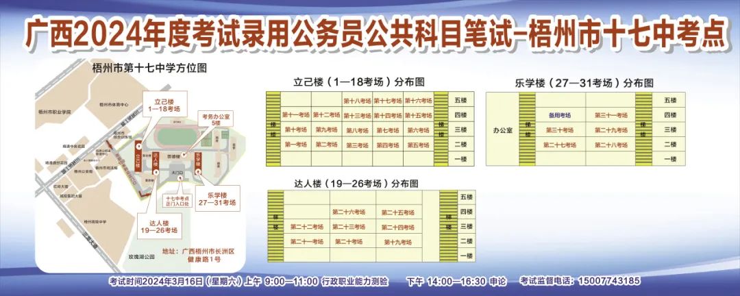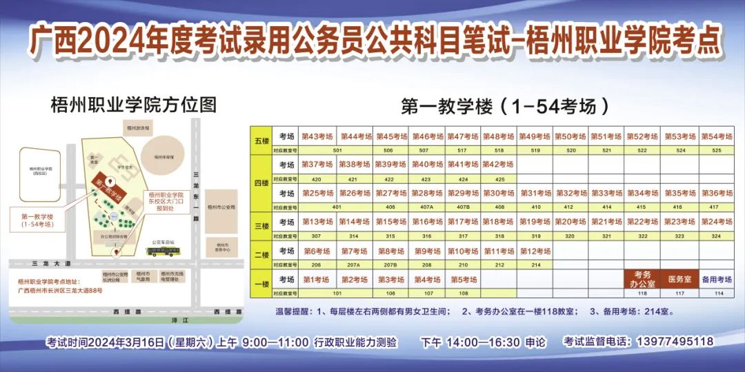 一、廣西2024年度考試錄用公務員(選調生)公共科目筆試將于3月16日舉行,梧州考區(qū)共設置9個考點,請考生提前熟悉各自考點位置、周邊環(huán)境及交通情況,考試當天提前出門做好準備,準時參加考試。特別提示:因考點停車場地有限,所有考生車輛不得進入考點,請考生規(guī)劃好前往考點的交通方式和路線。