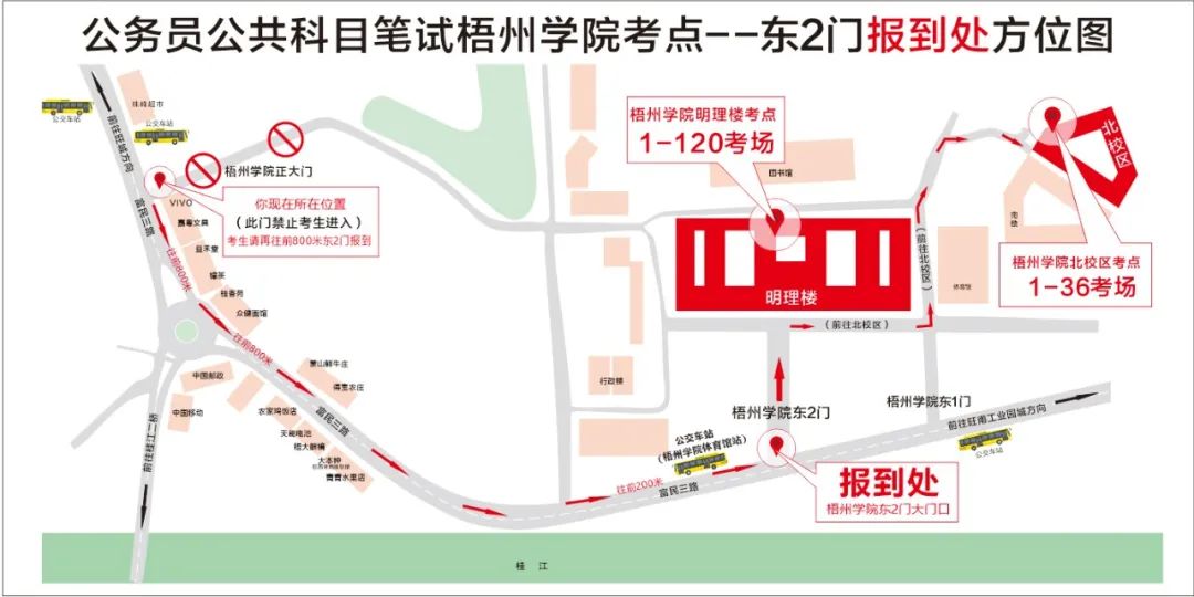 公交車參考:乘坐10路、32路、49路、49路延長線、蒼梧城鄉(xiāng)6路到梧州學院體育館站,下車后步行約200米到達梧州學院東大門??忌y(tǒng)一在梧州學院東大門進入,考點門口處于交通干道,送考車輛只能在東門外短暫停留,梧州學院南門及其他門無法核驗考生身份。從東大門進入明理教學樓考點考場步行約5分鐘,進入北校區(qū)教學樓考點考場步行約15分鐘,請規(guī)劃好進入考點時間。