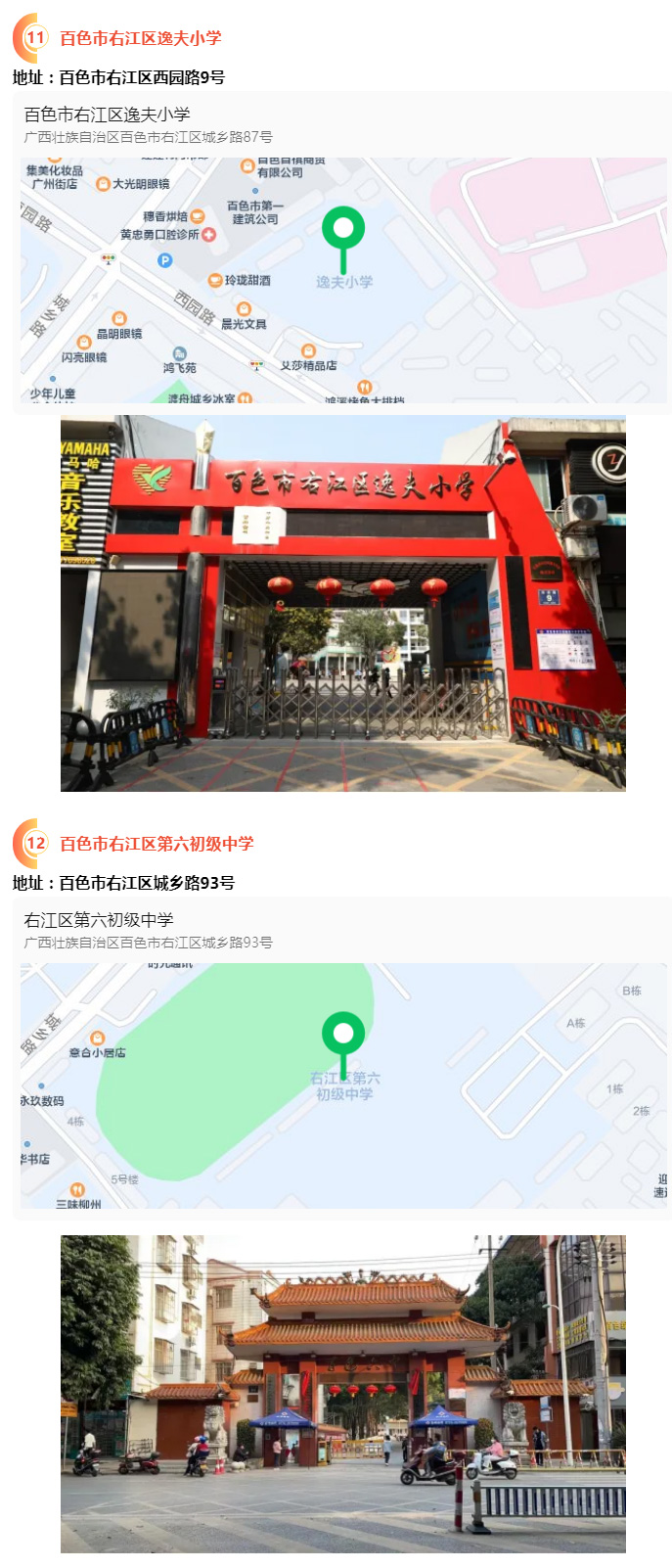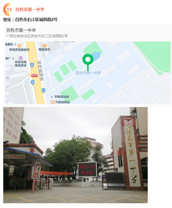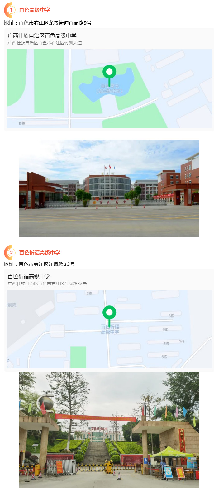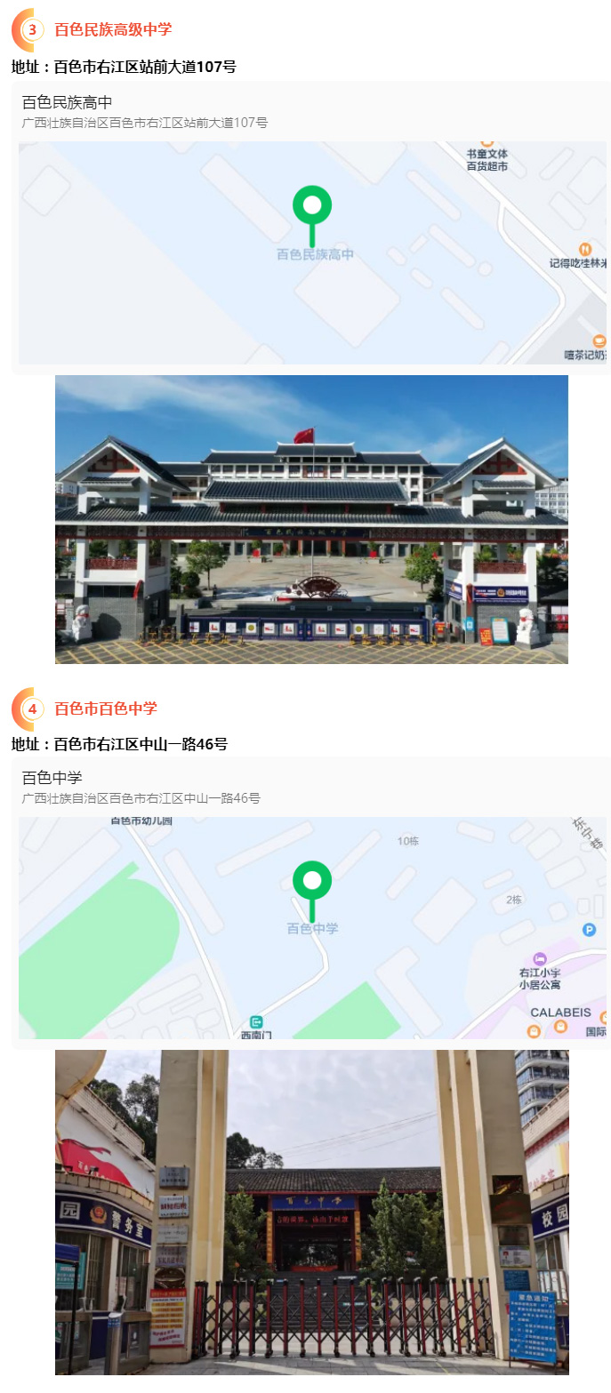 2.請?zhí)崆笆煜た键c地址,做好路線、住宿的安排。本次考試參考人數(shù)較多,考點分布分散,建議考生考前實地察看考點,確認(rèn)考點入口位置,防止走錯考點。請充分考慮考點周邊交通通行情況和停車場地容量,合理安排出行方式,預(yù)留充足時間,確保考試當(dāng)天按時到達。另外,考試期間百色市及各考點學(xué)校周邊的住宿比較緊張,請?zhí)崆邦A(yù)定。
