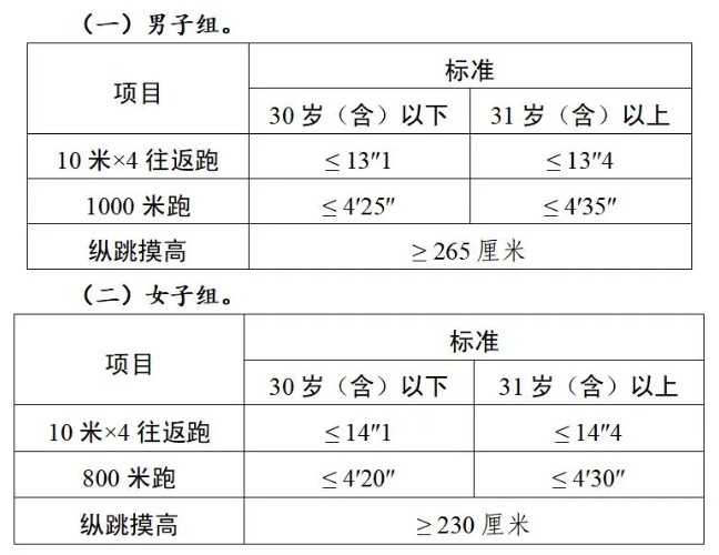 體能測(cè)評(píng)三項(xiàng)全部達(dá)標(biāo)方為合格。報(bào)考緊缺職位的人員,體能測(cè)評(píng)三項(xiàng)中有二項(xiàng)達(dá)標(biāo)的,視為合格。其中:縱跳摸高的測(cè)試次數(shù)不超過3次,10米×4往返跑的測(cè)試次數(shù)不超過2次,1000米跑/800米跑的測(cè)評(píng)次數(shù)為1次。