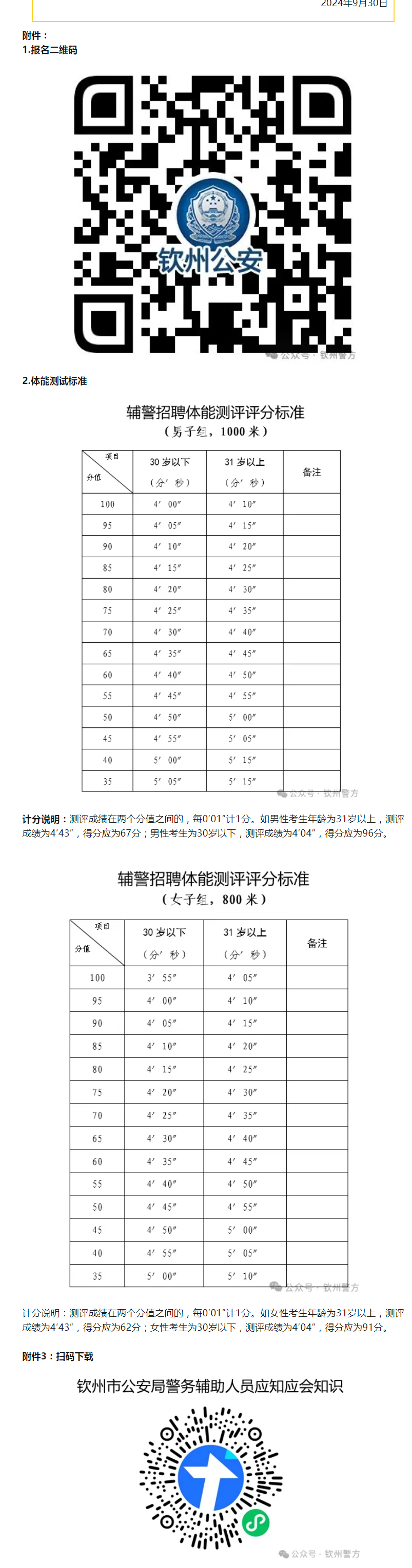 1.體能測試。所有資格審查合格的考生必須參加體能測試。體能測試項目為長跑(男子1000米,女子800米),體能測試計算成績,評分標(biāo)準(zhǔn)附后。