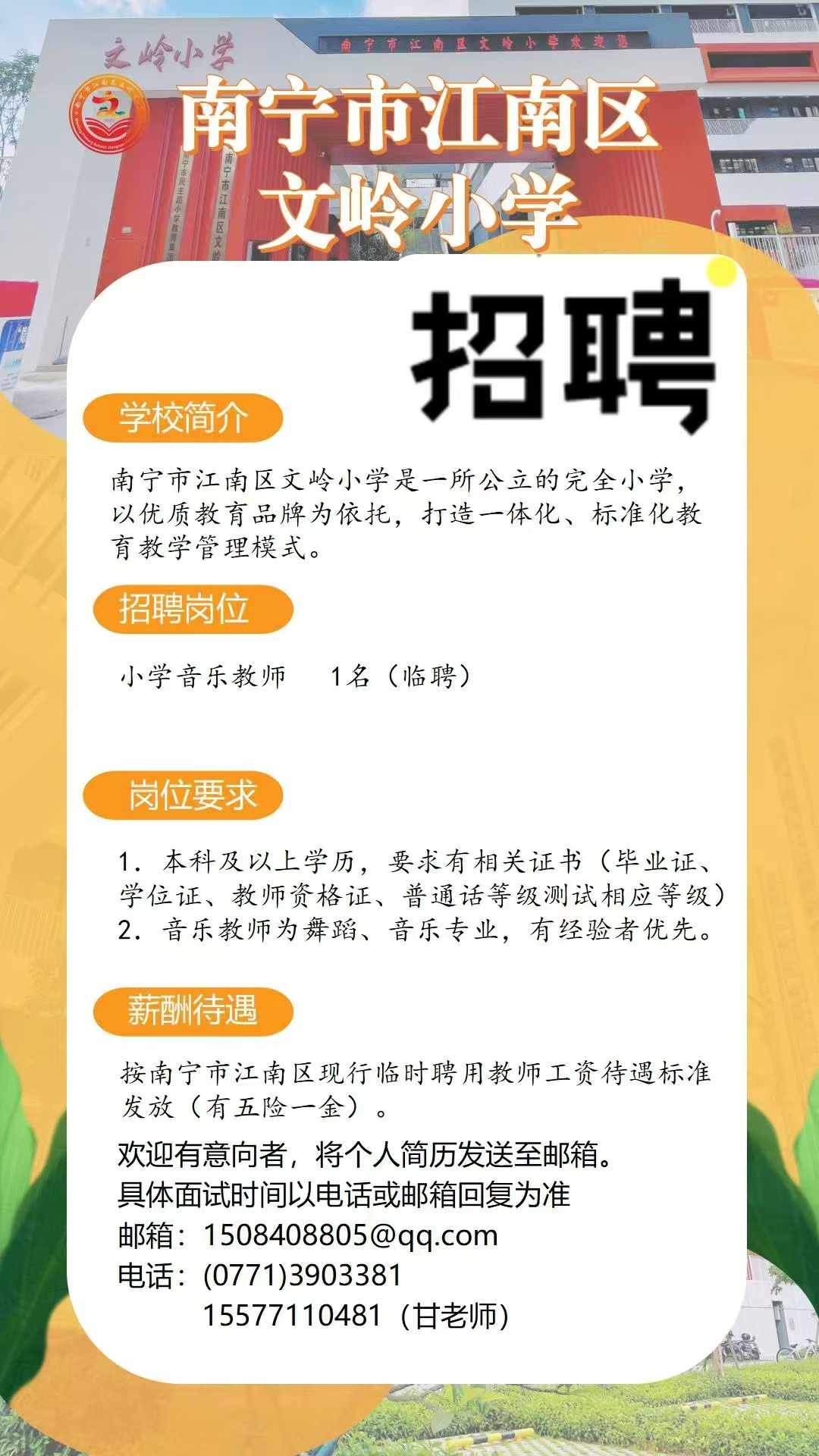 南寧市江南區(qū)文嶺小學(xué)招音樂(lè)老師