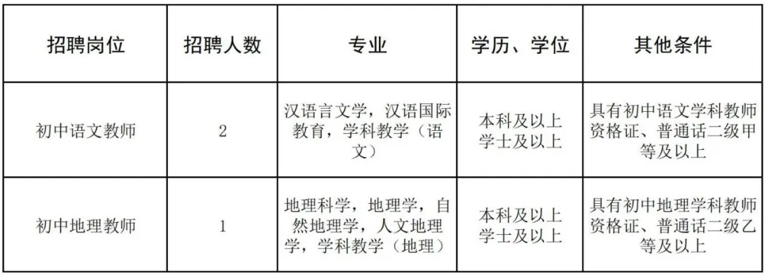 根據(jù)發(fā)展需要,學(xué)校擬招聘初中語文、初中地理頂崗教師共3人,具體招聘信息如下: