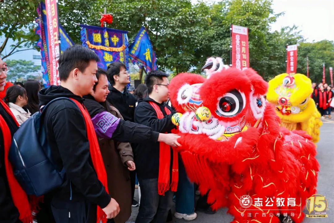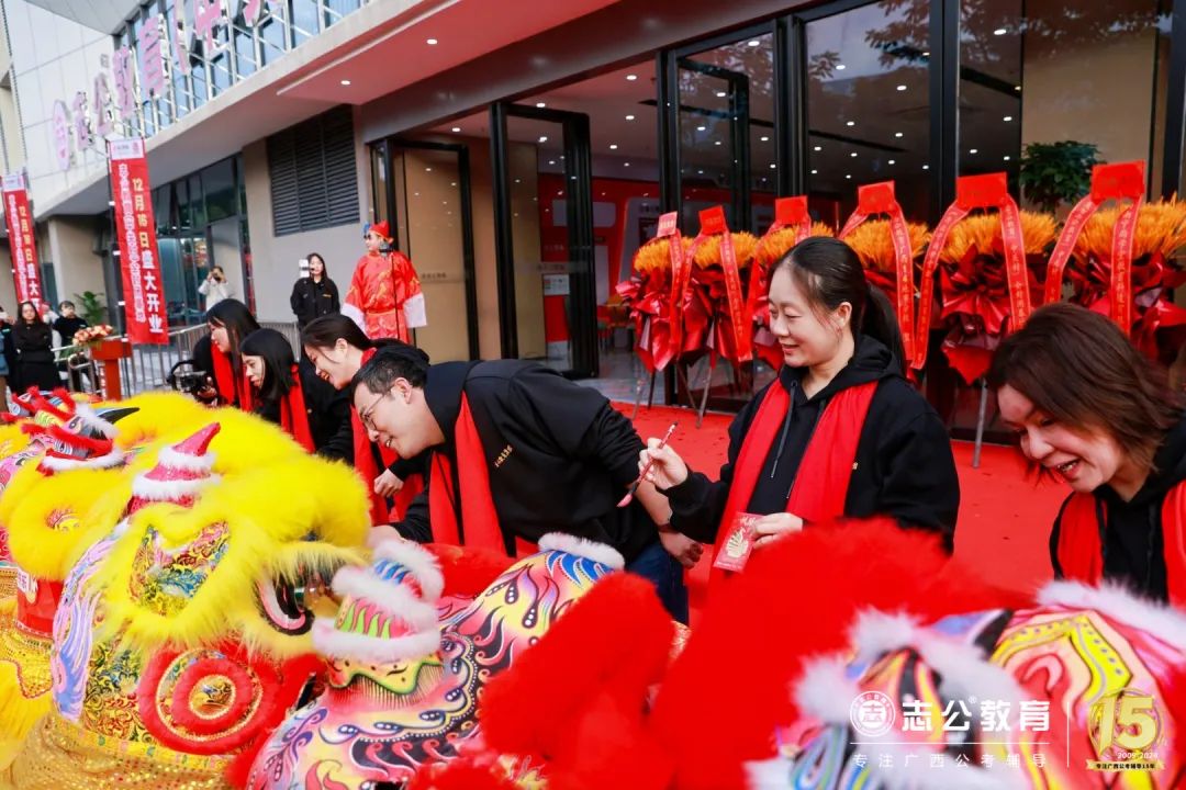 志公教育還專門請來了舞獅隊,舞獅點睛是重頭戲,董事長李勇帶領(lǐng)著公司領(lǐng)導們手持毛筆蘸取朱砂,對獅頭天庭進行點睛。