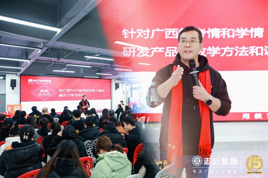 第一是極致本土化,董事長李勇表示這是志公教育集團安身立業(yè)的根本,他表示這要求對廣西公職考試響應速度要快,針對廣西的考情和學情,研發(fā)產(chǎn)品教學方法和課程資料,這是對教研院的考驗,明確表示未來要把錢投在學員的服務上、老師的數(shù)量、學習班主任。志公教育現(xiàn)在有志公教育(保稅區(qū))全封閉基地,志公教育(中關(guān)村)全封閉基地,未來希望在桂林,柳州,百色等地也建立基地,讓志公教育在八桂大地生根,實現(xiàn)各美其美,美美與共。