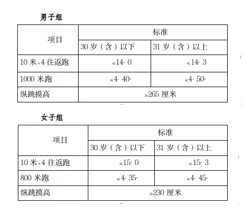 參照《關(guān)于印發(fā)公安機(jī)關(guān)錄用人民警察體能測(cè)評(píng)項(xiàng)目和標(biāo)準(zhǔn)(暫行)的通知》(人社部發(fā)〔2011〕48號(hào))的項(xiàng)目及測(cè)試規(guī)則,結(jié)合《公安民警體育鍛煉達(dá)標(biāo)手冊(cè)》成績(jī)標(biāo)準(zhǔn),本次體能測(cè)評(píng)的項(xiàng)目和標(biāo)準(zhǔn)如下: