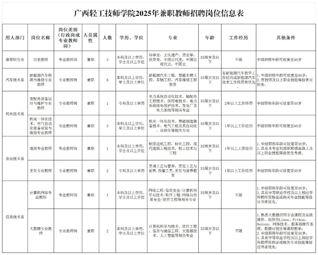 歷史教師,新能源汽車檢測與維修專業(yè)教師,變配電設(shè)備運(yùn)行與維護(hù)專業(yè)教師,機(jī)電一體化技術(shù)、電氣自動(dòng)化設(shè)備安裝與維修專業(yè)教師,造紙專業(yè)教師,烹飪專業(yè)教師,計(jì)算機(jī)網(wǎng)絡(luò)專業(yè)教師,大數(shù)據(jù)專業(yè)教師。