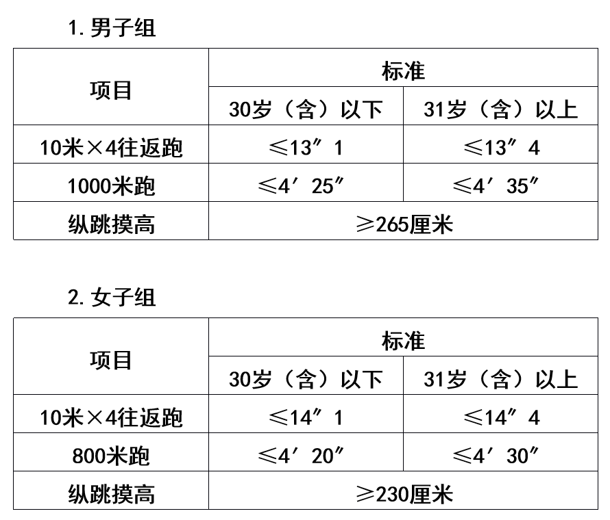 年齡計(jì)算時(shí)間截止到參加體能測(cè)評(píng)當(dāng)月??v跳摸高項(xiàng)目的測(cè)評(píng)次數(shù)不超過3次,10米×4往返跑項(xiàng)目的測(cè)評(píng)次數(shù)不超過2次,男子1000米跑、女子800米跑項(xiàng)目的測(cè)評(píng)次數(shù)均為1次。