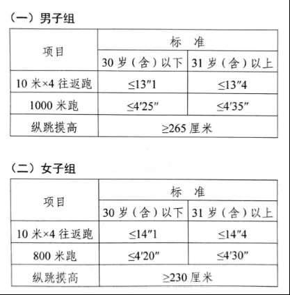 參照《公安機(jī)關(guān)錄用人民警察體能測(cè)評(píng)項(xiàng)目和標(biāo)準(zhǔn)》的項(xiàng)目及測(cè)試規(guī)則開(kāi)展體能測(cè)評(píng),本次體能測(cè)評(píng)的項(xiàng)目和標(biāo)準(zhǔn)如下: