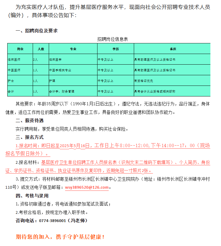2025年梧州市長(zhǎng)洲區(qū)長(zhǎng)洲鎮(zhèn)中心衛(wèi)生院公開(kāi)招聘公告