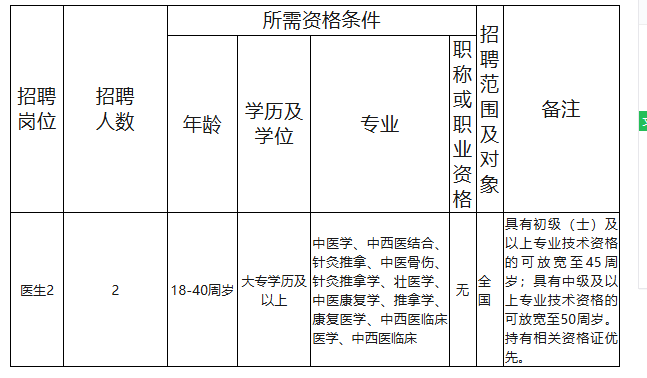 根據(jù)工作需要,決定面向社會(huì)公開招聘醫(yī)生(中醫(yī)類)2人,現(xiàn)將有關(guān)事項(xiàng)公告如下: