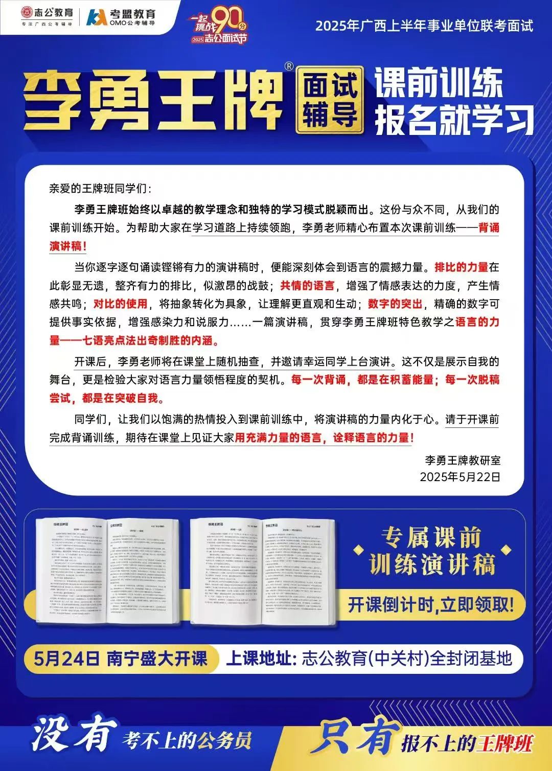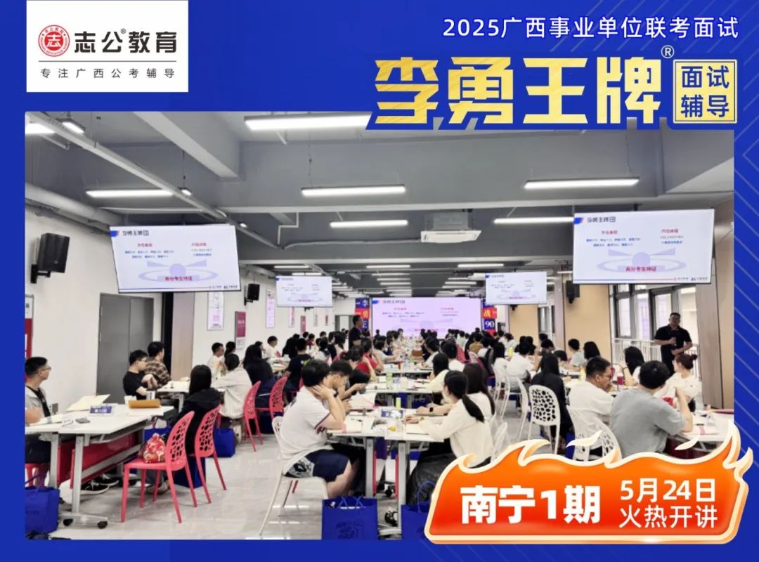 繼志公教育&李勇王牌®班教研室5月17日發(fā)布修改招生規(guī)則的通知后,各位未來“橘”長們,翹首以盼的時刻終于來啦!5月24日,志公教育李勇王牌®班——改革后的首個開班,在南寧火熱啟幕!現(xiàn)場學(xué)習(xí)氣氛爆棚,李勇老師與學(xué)員高頻互動,學(xué)員們直呼 “學(xué)到停不下來”!這不僅是一場面試特訓(xùn),更是一次思維與能力的雙重蛻變!