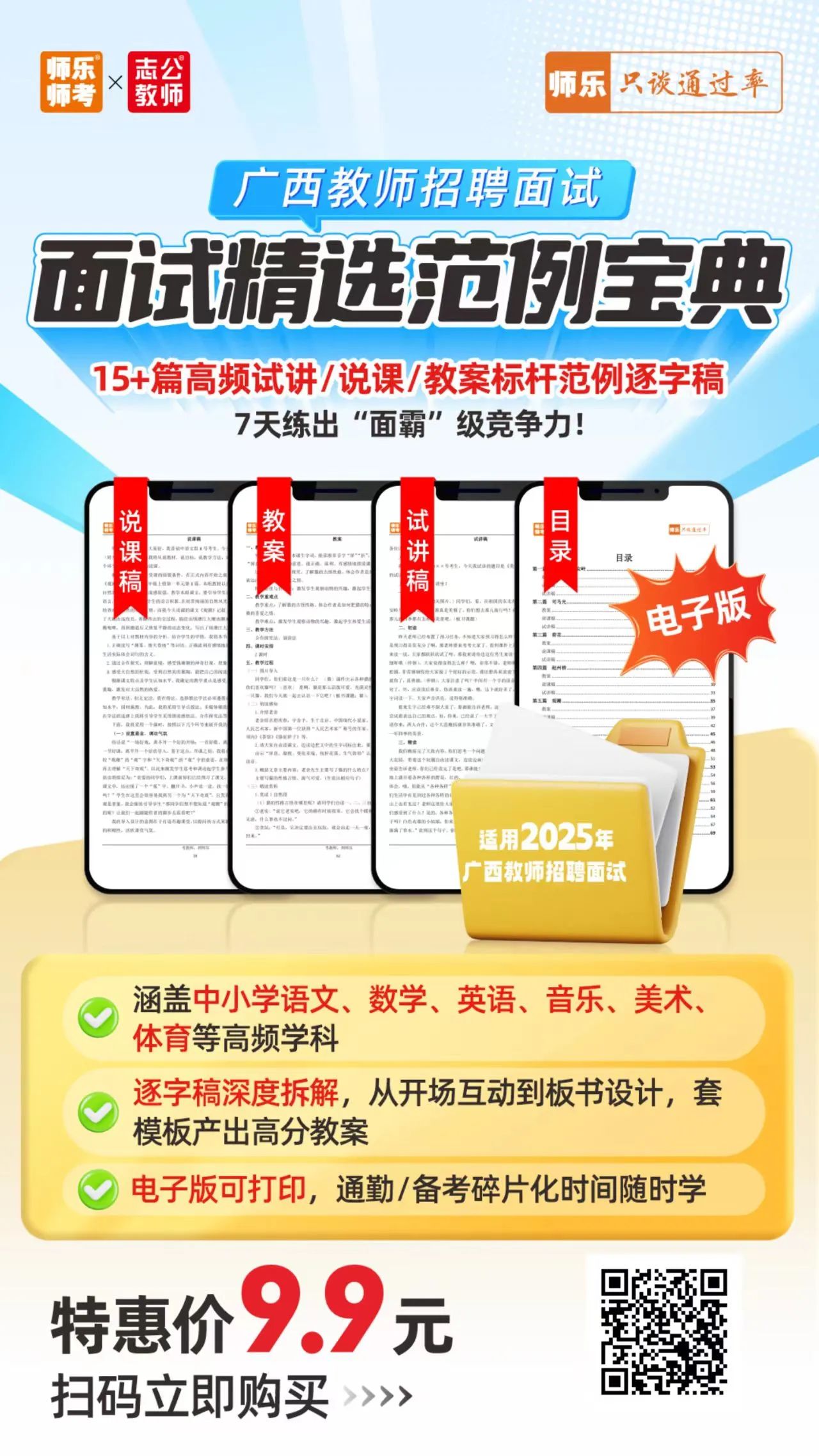 ??寫(xiě)作邏輯+面試導(dǎo)入金句點(diǎn)撥 ?含13+篇試講+說(shuō)課+結(jié)構(gòu)化 搶先體驗(yàn)價(jià):6.9元 ??14地市教招面試zhen題 了解試講/說(shuō)課/結(jié)構(gòu)化形式及內(nèi)容 面試禮儀課 ??面試禮儀干貨介紹 正反面案例直觀對(duì)比 ??著裝、問(wèn)候、儀態(tài)、言談禮儀等事項(xiàng)介紹 【師樂(lè)】廣西教招備考群 ??最新公告 備考資料 ??刷題打卡 考試交流