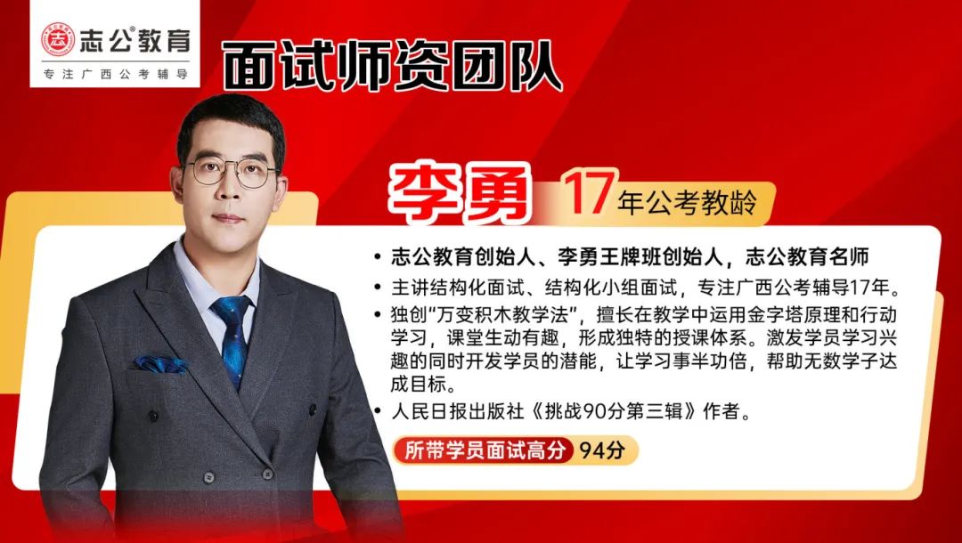 李勇——志公教育創(chuàng)始人、李勇王牌®班創(chuàng)始人,志公教育名師。主講結(jié)構(gòu)化面試、結(jié)構(gòu)化小組面試,專注廣西公考輔導(dǎo)17年。獨(dú)創(chuàng)“萬變積木教學(xué)法”,擅長在教學(xué)中運(yùn)用金字塔原理和行動學(xué)習(xí),課堂生動有趣,形成獨(dú)特的授課體系。激發(fā)學(xué)員學(xué)習(xí)興趣的同時開發(fā)學(xué)員的潛能,讓學(xué)習(xí)事半功倍,幫助無數(shù)學(xué)子達(dá)成目標(biāo)。同時也是人民日報出版社《挑戰(zhàn)90分第三輯》作者。
