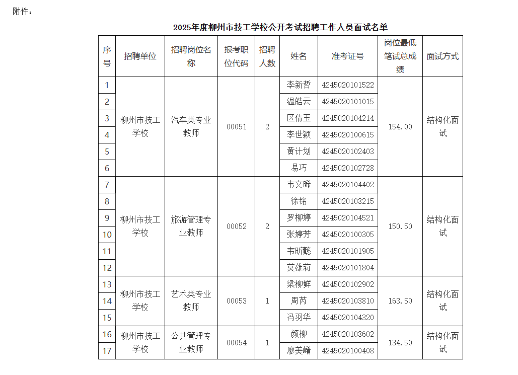 附件:2025年度柳州市技工學(xué)校公開考試招聘工作人員面試名單