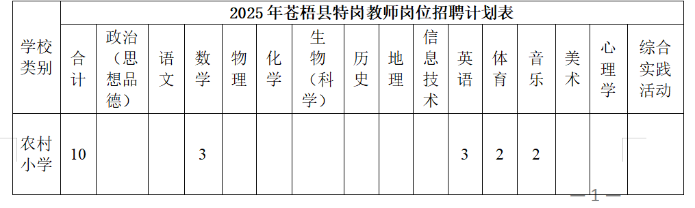 經(jīng)自治區(qū)教育廳、財政廳、人社廳批準,今年我縣農(nóng)村義務教育階段學校教師特設崗位計劃(以下簡稱“義教特崗”)10名,其中小學崗位10名(詳情見下表)。