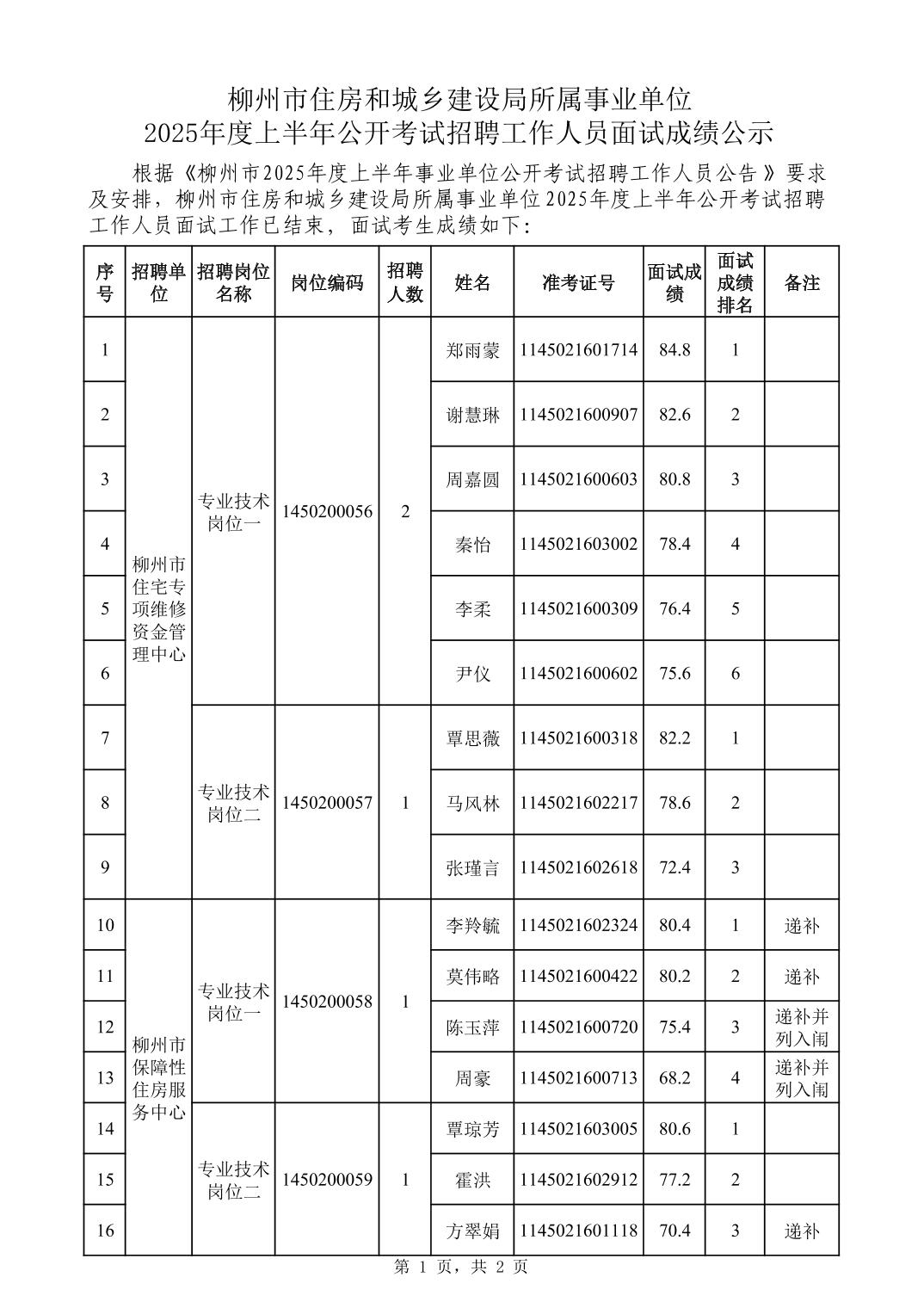 柳州市住房和城鄉(xiāng)建設(shè)局所屬事業(yè)單位2025年度上半年公開考試招聘工作人員面試成績(jī)公示