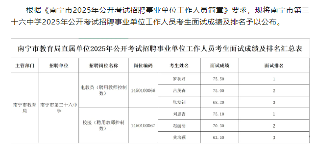 南寧市教育局關(guān)于公布南寧市第三十六中學(xué)2025年公開考試招聘事業(yè)單位工作人員考生面試成績(jī)及排名的公告