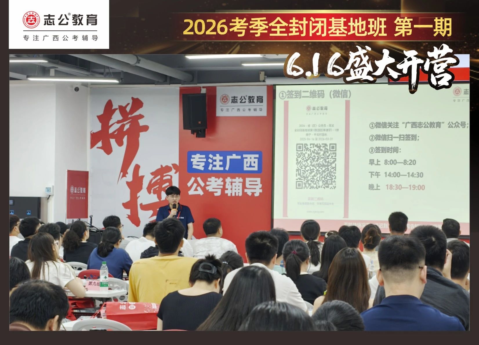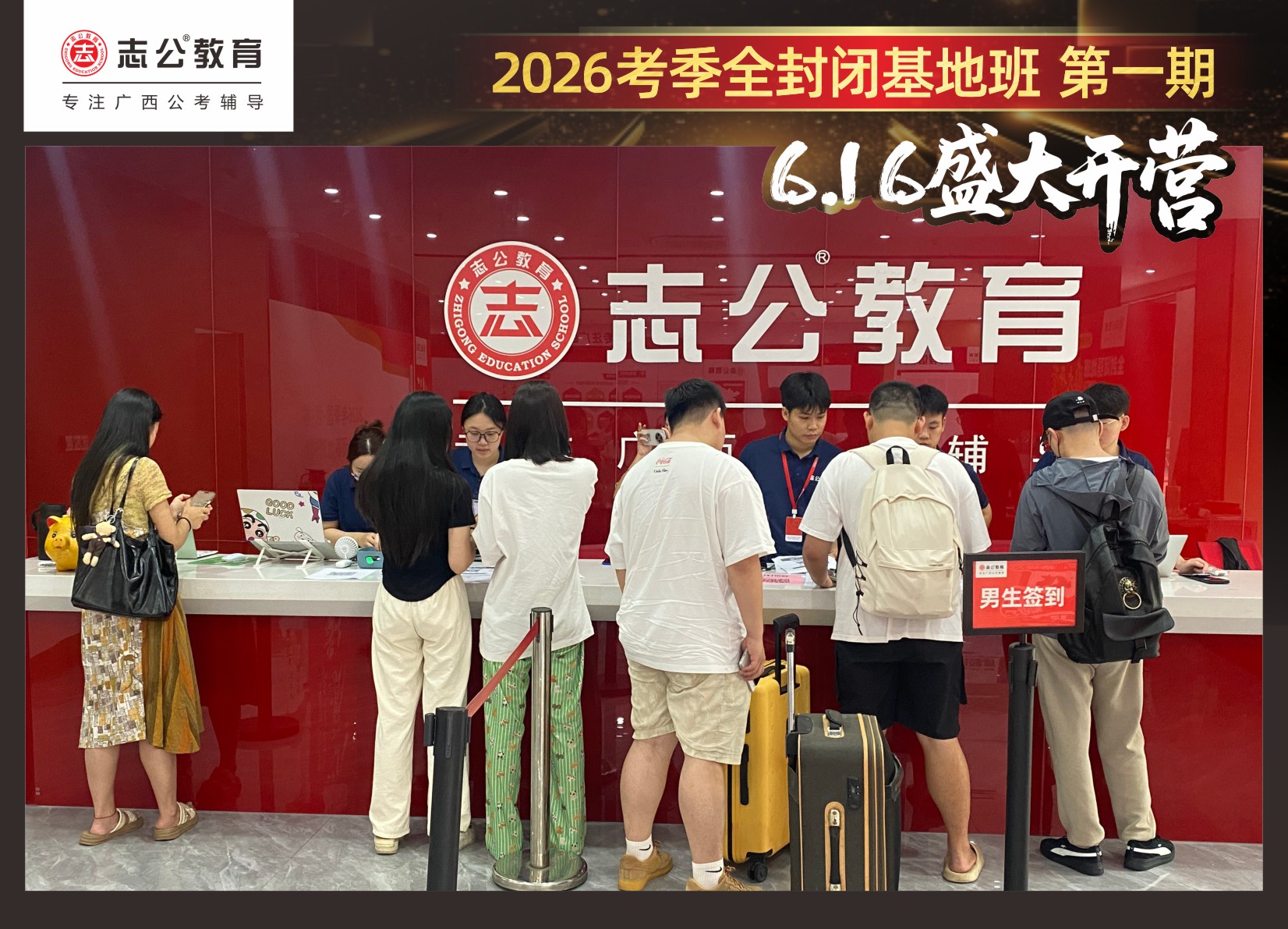 由于這段時間受臺風影響,南寧迎來下雨天,但學員們滿懷先一步備考,快一步成功圓夢的滿滿炙熱信心,早早就在志公教育(中關(guān)村)全封閉基地前臺等候,6月16日,志公教育26考季全封閉基地班第1期的學員們齊聚一堂,正式開啟他們的公考備戰(zhàn)之旅。簽到環(huán)節(jié)作為基地班課程的第一站,不僅是對學員們的歡迎儀式,更是他們邁向夢想的第一步。