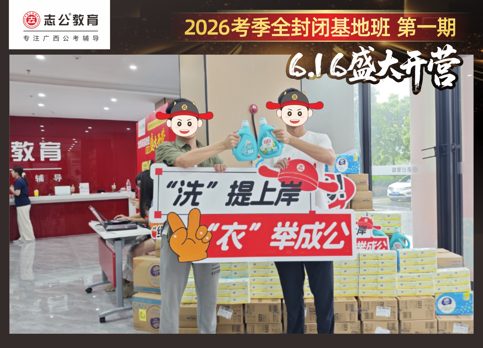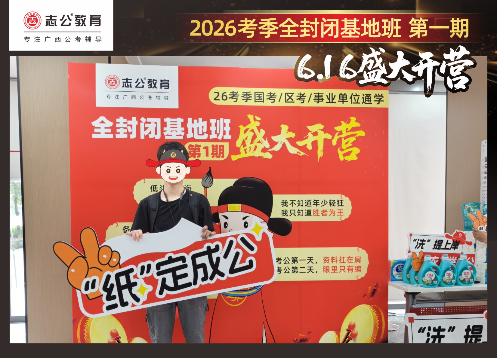 今天的開班還有一系列小活動噢~瞧!——“學員打卡活動”,所有今天到場的基地班學員,通過做一些小任務的方式,可以到前臺領(lǐng)取生活禮包即可領(lǐng)取生活禮品1份(一提六包的紙巾,或者一瓶洗衣液),這也是志公教育對所有學員的美好祝愿,預祝大家未來能夠“紙”定成公,“洗”提上/岸,“衣舉成公”!