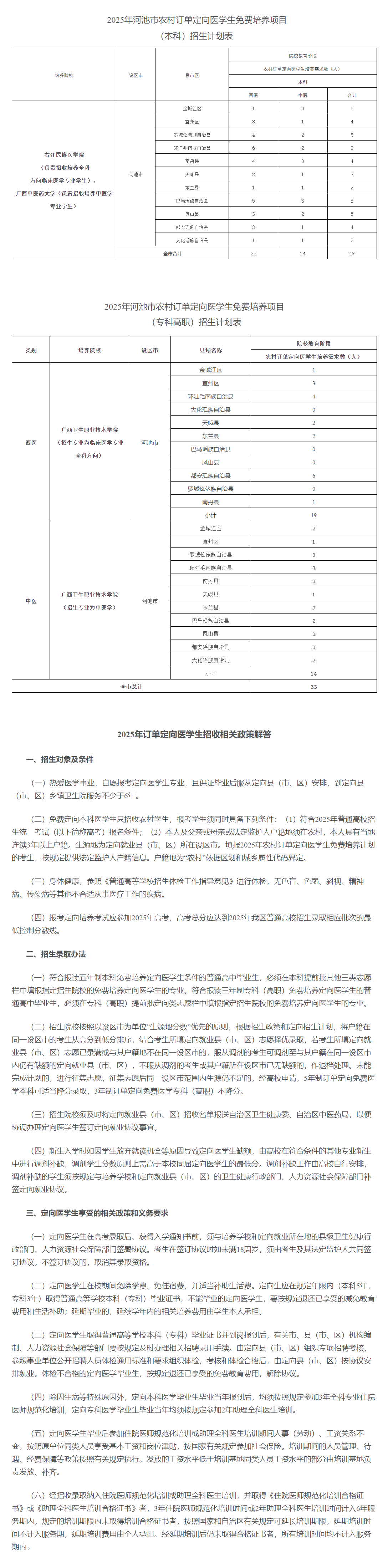 2025年,廣西繼續(xù)實施定向醫(yī)學生免費培養(yǎng)項目,面向全區(qū)招生。河池市共有80個名額,其中,本科47個,???3個,培養(yǎng)院校分別為:右江民族醫(yī)學院、廣西中醫(yī)藥大學、廣西衛(wèi)生職業(yè)技術(shù)學院,培養(yǎng)專業(yè)為臨床醫(yī)學和中醫(yī)學。