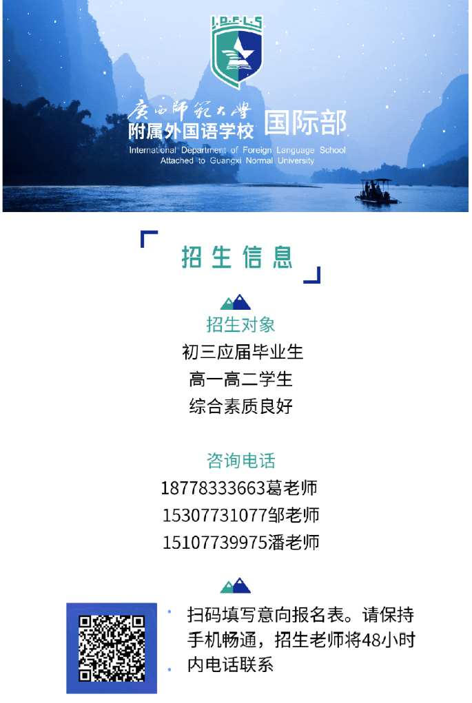 廣西師范大學附屬外國語學校位于以山水之美聞名世界的桂林市,教育教學成績斐然。其國際部是廣西壯族自治區(qū)最早批準成立的國際部,自2011年成立以來,積極引進國外先進教育理念,整合師大附外的優(yōu)質(zhì)基礎教育資源,堅持社會主義核心價值觀為導向,培養(yǎng)具有崇高理想、愛國信念和突出跨文化交際能力的社會主義新型人才。