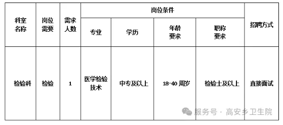 來(lái)賓市興賓區(qū)高安鄉(xiāng)衛(wèi)生院是一家集醫(yī)療、預(yù)防保健、康復(fù)醫(yī)療于一體的國(guó)家公立基層醫(yī)療機(jī)構(gòu),現(xiàn)有職工45人,服務(wù)人口約2萬(wàn)人。因工作需要,我院擬向社會(huì)公開招聘編制限額外檢驗(yàn)科人員1名,現(xiàn)將有關(guān)招聘事項(xiàng)公告如下: