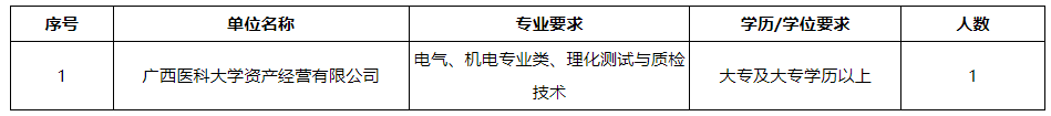 廣西醫(yī)科大學(xué)資產(chǎn)經(jīng)營有限公司(以下簡稱公司)是由廣西醫(yī)科大學(xué)于2011年8月3日獨(dú)資設(shè)立,經(jīng)營管理廣西醫(yī)科大學(xué)經(jīng)營性國有資產(chǎn)和對外投資的股權(quán)。公司依托學(xué)校和附屬醫(yī)院的資源優(yōu)勢,圍繞醫(yī)藥、養(yǎng)老、醫(yī)學(xué)檢驗(yàn)、大健康項(xiàng)目等領(lǐng)域開展投資與合作,積極探索產(chǎn)學(xué)研協(xié)同發(fā)展。根據(jù)工作需要,現(xiàn)面向社會(huì)公開招聘工勤崗工作人員,具體招聘事宜如下: