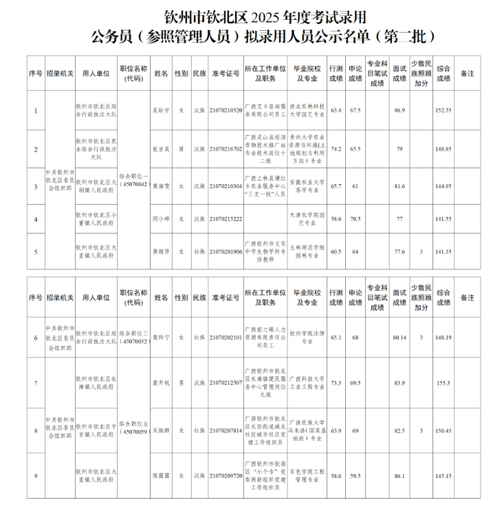 根據(jù)《廣西壯族自治區(qū)2025年度考試錄用公務員公告》等有關(guān)規(guī)定,經(jīng)過公開報名、資格審查、筆試、面試、體檢、考察等程序,擬錄用吳軒宇等9名同志為公務員(參照管理人員),現(xiàn)予以公示(附件)。公示期為5個工作日,如對擬錄用人員的錄用資格有異議,請在公示期內(nèi)向中共欽州市欽北區(qū)委員會組織部干部監(jiān)督股實名反映。