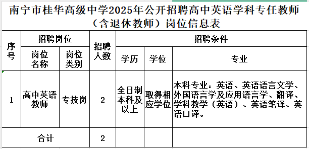 3.網(wǎng)上報(bào)名。應(yīng)聘者需規(guī)范填寫(xiě)《南寧市桂華高級(jí)中學(xué)公開(kāi)招聘專(zhuān)任教師報(bào)名表》(見(jiàn)附件2),將個(gè)人應(yīng)聘證明材料一并打包(學(xué)科+姓名+聯(lián)系電話)發(fā)送到nnsghgjzx2022@163.com郵箱。