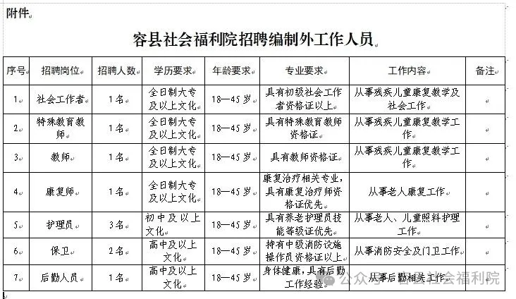 根據(jù)工作需要,容縣社會福利院面向社會公開招聘編制外工作人員若干名,現(xiàn)將有關(guān)事項(xiàng)公告如下:
