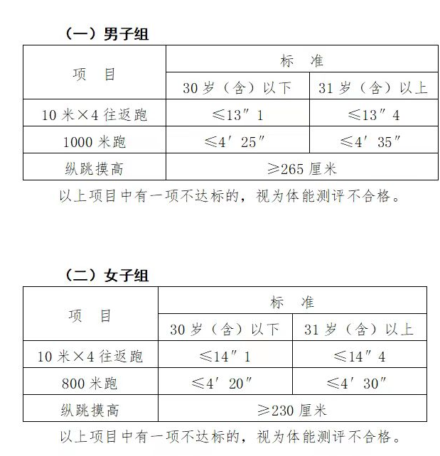 體測項目為縱跳摸高、10米×4往返跑和1000米(男)或800米(女)長跑,體能測試項目評分標準依據《公安機關錄用人民警察體能測評項目和標準(暫行)》執(zhí)行(見附件3),體能測試項目規(guī)則按照《公安機關錄用人民警察體能測評實施規(guī)則》執(zhí)行(見附件4)。