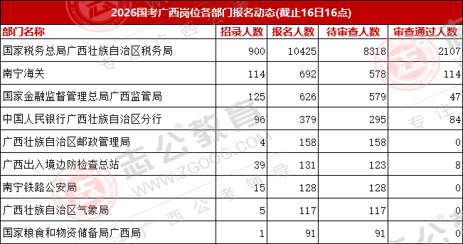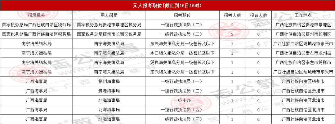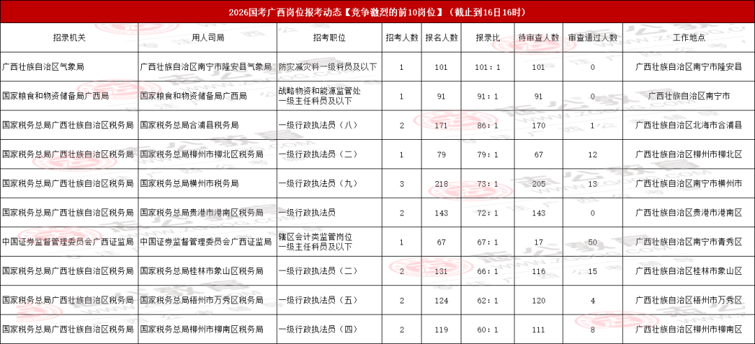 今天是報(bào)名第二天,小伙伴可要抓住此次上/岸機(jī)會(huì)啦!來看看廣西今天的報(bào)名數(shù)據(jù)吧。截止10月16日下午16:00,已經(jīng)有13116名考生報(bào)名,最熱崗220人報(bào)名!從各項(xiàng)數(shù)據(jù)來看,部分考生可能還持觀望態(tài)度。在接下來的報(bào)名時(shí)間里,可能會(huì)迎來報(bào)名人數(shù)大幅增長的情況,大家可以密切關(guān)注。