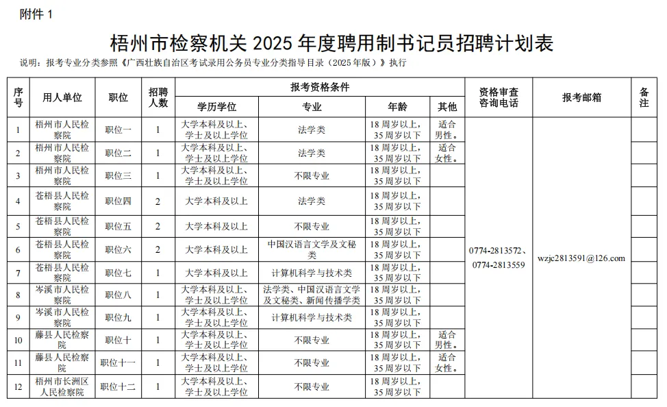 詳見《梧州市檢察機(jī)關(guān)2025年度聘用制書記員招聘計劃表》(附件1)。