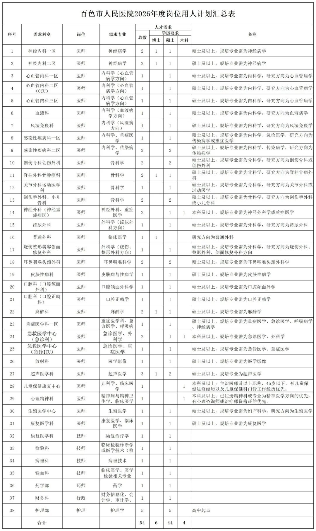 學科齊全,重點突出。醫(yī)院脊柱外科是國家臨床重點???,神經(jīng)外科、消化內(nèi)科、皮膚性病科、麻醉科、重癥醫(yī)學科、兒科、醫(yī)學影像科、呼吸與危重癥醫(yī)學科、創(chuàng)傷外科、耳鼻咽喉頭頸外科是廣西臨床重點???心血管內(nèi)科、感染性疾病科、急診醫(yī)學科、普通外科、骨科、康復醫(yī)學科、產(chǎn)科、腫瘤內(nèi)科是廣西醫(yī)療衛(wèi)生重點培育???擁有5個國家級培訓基地(國家級住院醫(yī)師規(guī)范化培訓基地、國家級腦卒中篩查防治基地、國家級高級卒中中心和國家級胸痛中心和中國創(chuàng)傷救治聯(lián)盟創(chuàng)傷救治中心建設(shè)單位)。醫(yī)院設(shè)有復旦大學附屬華山醫(yī)院周良輔院士工作站和上海長海醫(yī)院李兆申院士工作站;是廣西第一家通過IS09001:2000國際標準質(zhì)量管理體系認證的地市級醫(yī)院,是廣西醫(yī)療保健基地、百色市基本醫(yī)療服務和臨床醫(yī)學人才培訓基地。