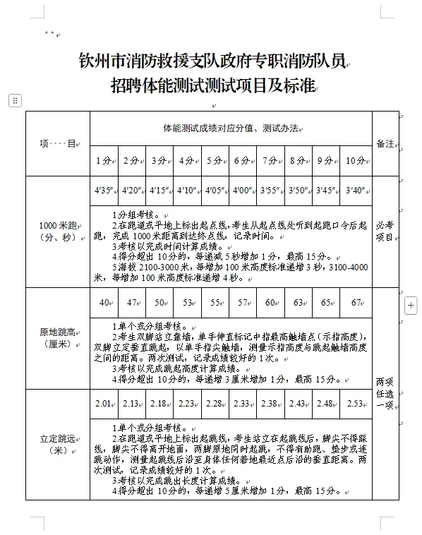 2.體能測試:(1)必考項目:1000米跑;(2)選考項目:①立定跳遠、原地跳高二選一;②單杠引體向上、俯臥撐二選一;③10米×4往返跑、100米跑二選一;(3)注意事項:應(yīng)聘人員須參加體能測試,并當(dāng)場簽訂《體能測試健康安全風(fēng)險承諾書》,體能測試有兩項及兩項以上不得分的視為不合格(標(biāo)準(zhǔn)參照附件)。未按時參加或因身體原因無法測試者,視為自動放棄。(體能測試測試項目及標(biāo)準(zhǔn)附后)