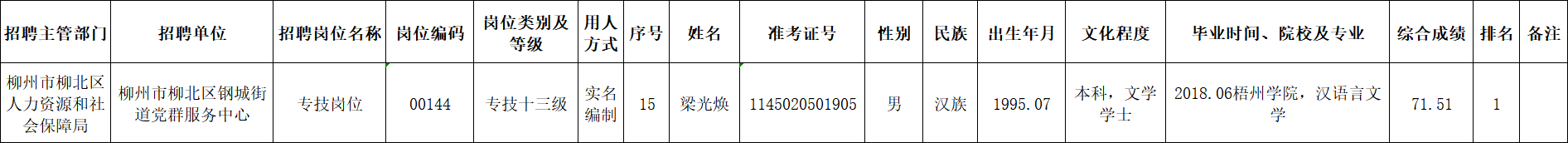 根據(jù)《柳州市2025年度下半年事業(yè)單位公開考試招聘工作人員公告》要求及安排,梁光煥同志經(jīng)面試、考察、體檢合格,符合聘用條件。經(jīng)研究決定,擬聘用梁光煥同志為我區(qū)事業(yè)單位工作人員,現(xiàn)予以公示,公示期為5個(gè)工作日(2026年1月22日至2026年1月28日)。對(duì)擬聘用的同志如有異議,請(qǐng)以書面形式,并署真實(shí)姓名和聯(lián)系地址,于2026年1月28日前郵寄或直接送我單位(地址:柳州市勝利路12-8號(hào)柳北區(qū)政府4樓417室;郵編:545002,電話0772-2513360),群眾如實(shí)反映有關(guān)問題受法律保護(hù)。