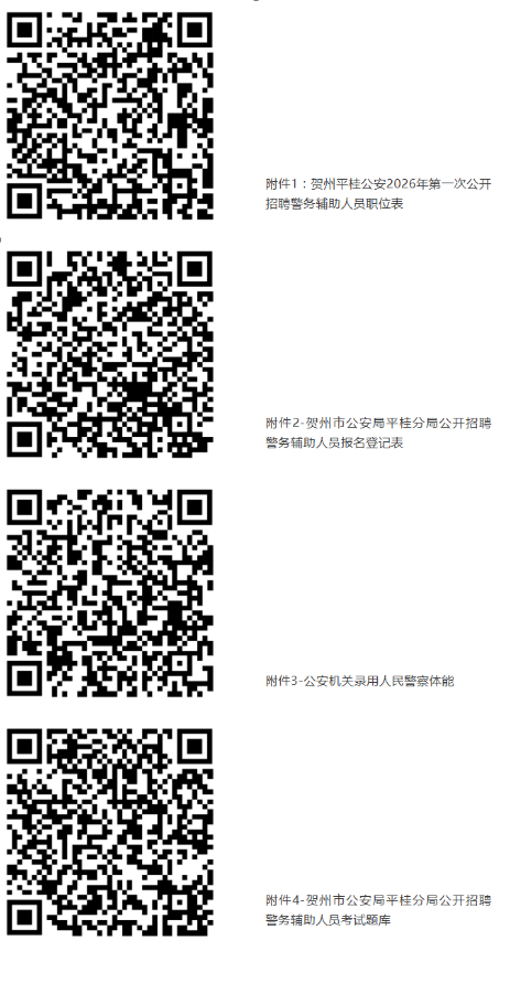 報考人員自2026年1月26日起,可通過賀州市公共就業(yè)和人才服務(wù)中心“賀州市微就業(yè)”官方微信(gxhzjy)、賀州市公安局平桂分局“平桂警方”官方微信(pggafj)查閱招聘簡章及《職位計(jì)劃表》(附件1)等相關(guān)招聘信息。