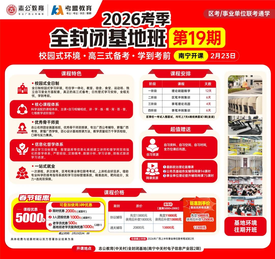 ?校園式環(huán)境,隔絕外界干擾:志公教育(中關村)2026考季全封閉基地班19期打造全日制校園式學習環(huán)境,高三嚴管式備考,一直可以學到考前。如果你自律性較差,需要一個好的學習氛圍和環(huán)境;如果你想要更快速上/岸,那你需要一個科學的學習體系,如果你想要考更好的職位,那你需要個性化和有效的提分方案,那么恭喜你,已經(jīng)找到了解決方法,請來志公教育全封閉基地班!