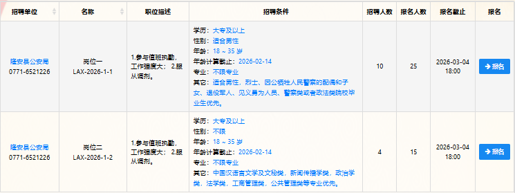 本次公開(kāi)招聘輔警14人,主要安排在隆安縣公安局各警種、各部門(mén)、各派出所,詳見(jiàn)《隆安縣公安局2026年度公開(kāi)招聘警務(wù)輔助人員職位計(jì)劃表》(附件1)。